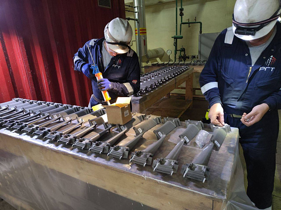 Самого большого внимания специалистов потребовал выходной диффузор. Данный узел эксплуатируется уже более 10 лет, в связи с чем потребовалось устранение трещин (более 50 шт.), как в местах соединений элементов конструкций, так и в самом теле корпуса. Все замечания в процессе ремонта были устранены, что подтвердил капиллярный метод неразрушающего контроля каждого сварного соединения. Все работы по металлобработке, сварке и неразрушающему методу контроля выполнены специалистами ООО «РГТ» в полном соответствии с технологиями завода-изготовителя – GE.